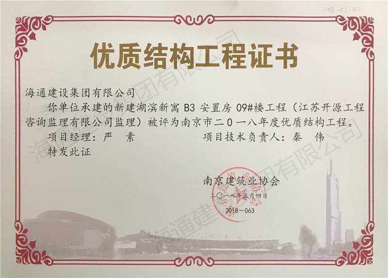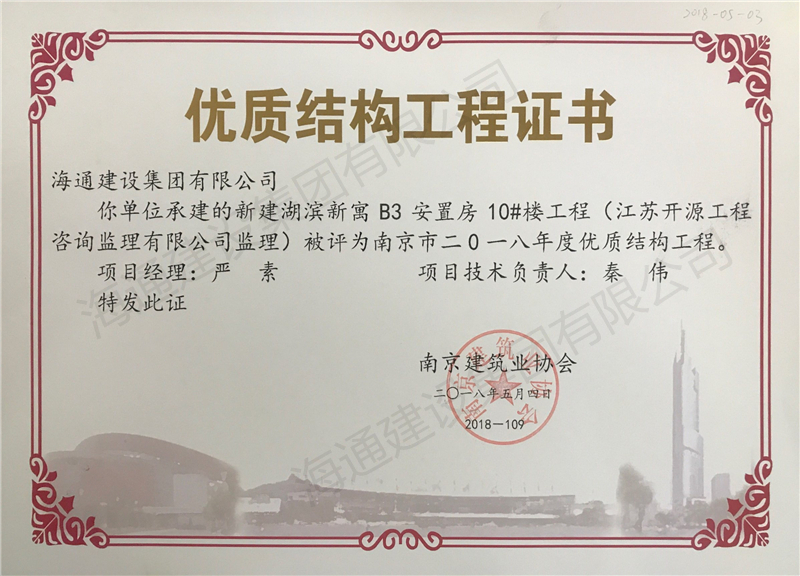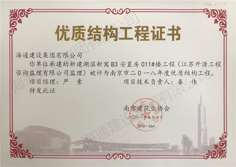 南京市優(yōu)質結構2018-新建湖濱新寓B3安置房08#樓工程