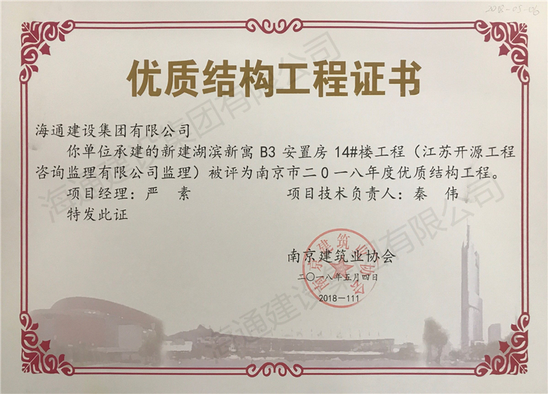 南京市優(yōu)質結構2018-新建湖濱新寓B3安置房14#樓工程