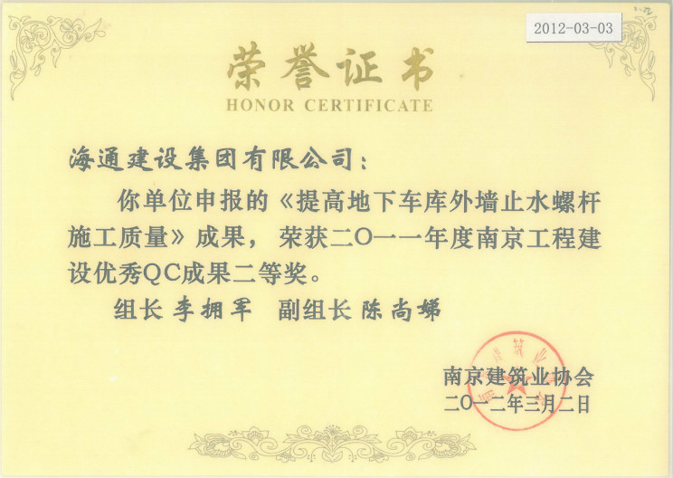 2011年度南京工程建設(shè)優(yōu)秀QC成果二等獎