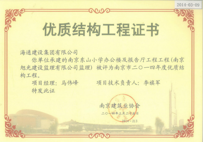 南京東山小學(xué)辦公樓及報(bào)告廳工程2014年度優(yōu)質(zhì)結(jié)構(gòu)工程
