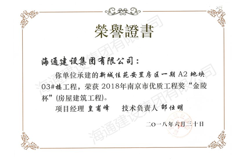 南京市金陵杯2018新城佳苑安置房區(qū)一期A2地塊03#樓工程