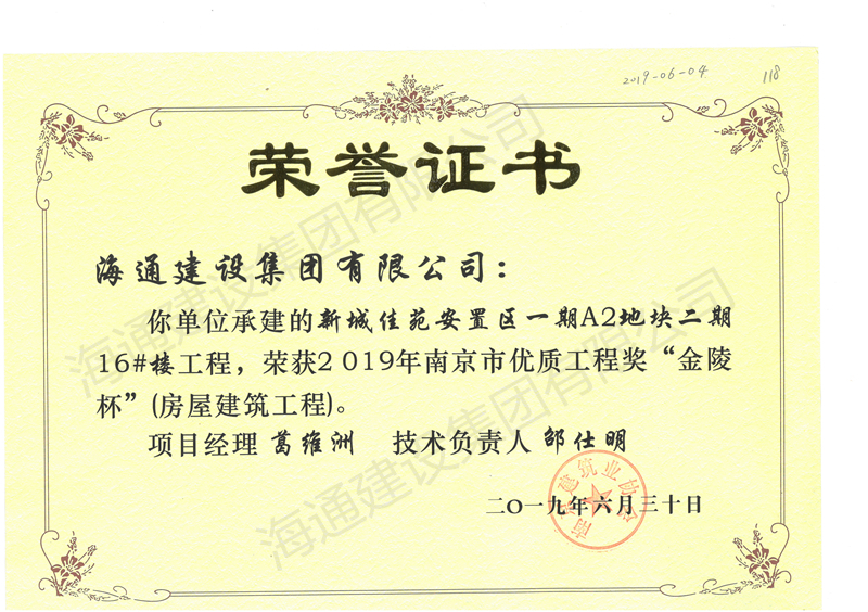 南京市金陵杯2019新城佳苑安置區(qū)一期A2地塊16#樓工程