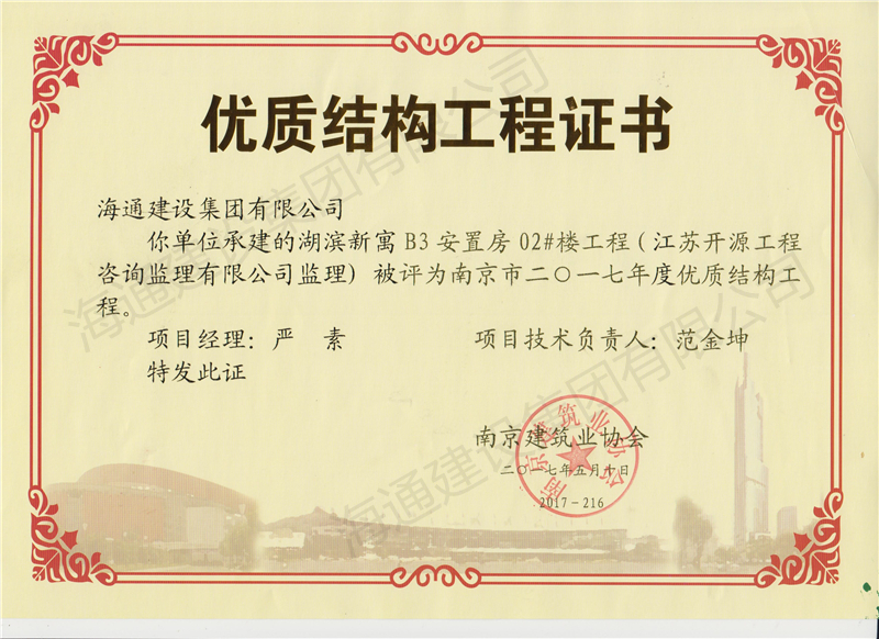 南京市優(yōu)質(zhì)結(jié)構(gòu)2017湖濱新寓B3安置房02#樓工程榮獲